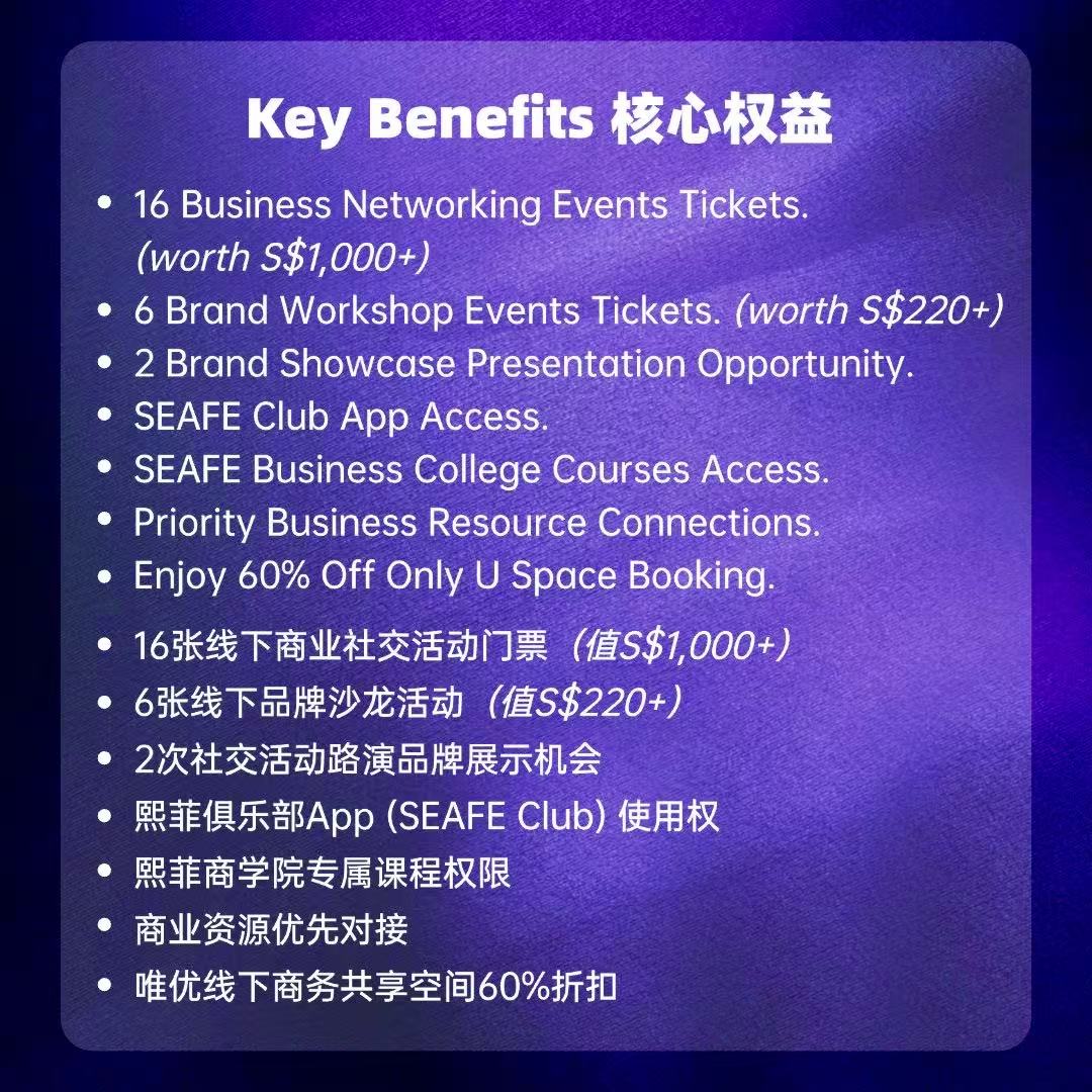 • 16张线下商业社交活动门票(值S$1,000+)