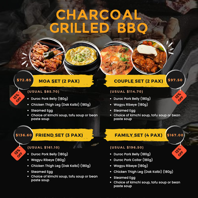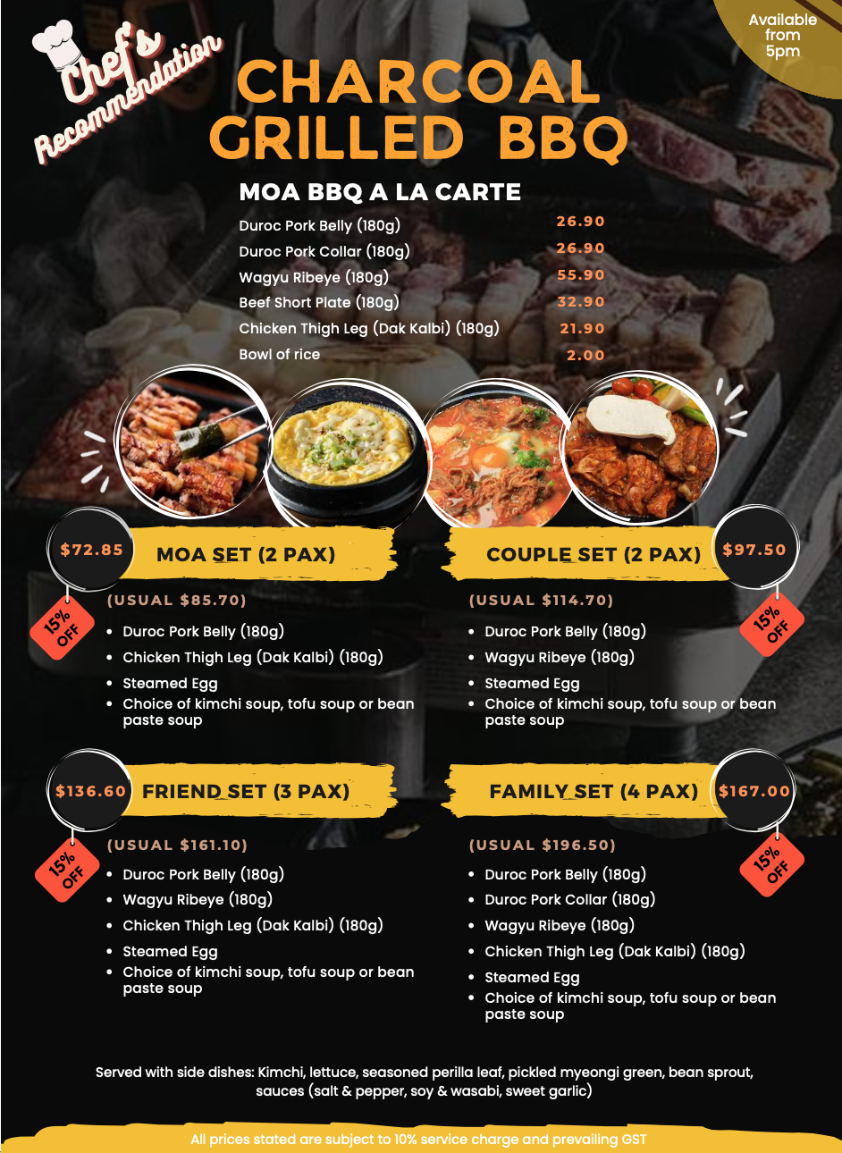 The Restrobar offers a wide variety of Korean dishes, including Wagyu Tteokgalbi, Pork Belly Gui, Daktori Tang (Spicy Chicken Stew), Dwaeji Gukbap (Deep Flavor Pork Soup), Bibimbap, Hotplate BBQ Dinner Sets with Premium Meats, Cheese Steamed Egg & Korean Tapas, etc. MOA Restrobar is committed to using fresh, high-quality ingredients and traditional cooking methods to create delicious and authentic Korean food.